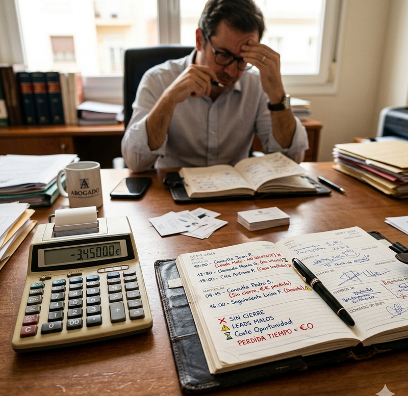 Un abogado con una tarifa horaria de 150 €/hora que dedica cuatro horas semanales a consultas que no cierran está perdiendo 2.400 € al mes en tiempo facturable no generado. En un año, ese número supera los 28.000 €. No lo pierde en mala gestión ni en malos clientes: lo pierde en un sistema de captación que atrae en lugar de filtrar. Y ninguna agencia que cobre por volumen de leads tiene incentivo para decírselo.